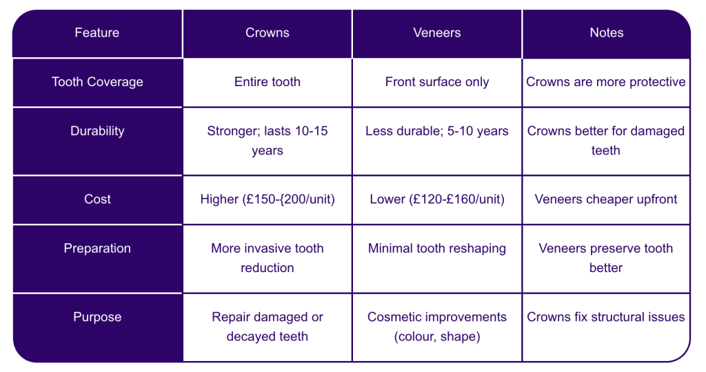 The NHS states crowns are indicated when a tooth is broken, worn down, or when a large cavity threatens its integrity. They are often chosen after root canal treatments or to improve aesthetics in cases of discoloured or malformed teeth (NHS guidance on crowns).
