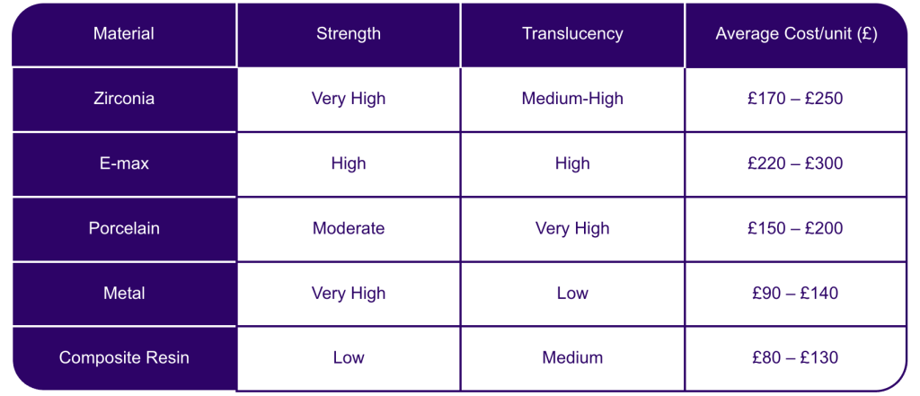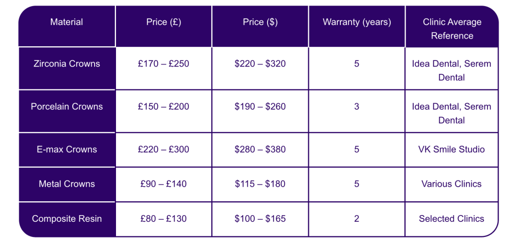 Zirconia crowns usually come with a 5-year warranty due to their high durability. E-max crowns offer warranties between 3 to 5 years, reflecting their balance of aesthetics and strength. Clinics follow strict guidelines to provide reliable aftercare and warranty coverage. (NHS guidance)